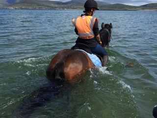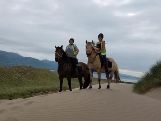 On our final day our special guide Eric leads us on an exhilarating ride through the dunes at Inch which feel like a roller coaster ride on horses. Fast trots and gallops through windy trails that make the heart race! This is where the fitness of our horses really shines; your mount carrying you effortlessly through these sandy hills and then happy to gallop endlessly on the beach. After a long lunch with lots of friendly banter Louise will lead us safely back towards our original destination. Being a local herself, Louise is gifted with her knowledge of the Dingle peninsula. She guides us through the hills along the Dingle way, where we overlook the magnificent lake that lies under the Slieve Mish range and go on to explore Átha-na-Scáil, meaning in english the ‘River of the Hero’. The legendary hero being ‘Cú Chulainn’, whose grave is reputed to be on the side of the mountain above Droumavalla, north of Annascaul (birthplace of Tom Crean, the famed Antarctic explorer). As we complete our ride, we will have covered many miles, had some fantastic riding and enjoyed the most spectacular views Ireland has to offer. Tonight the horses are boxed home from Minard Castle. We all meet back at Dingle Horse Riding for conversation, libation and theorisation!